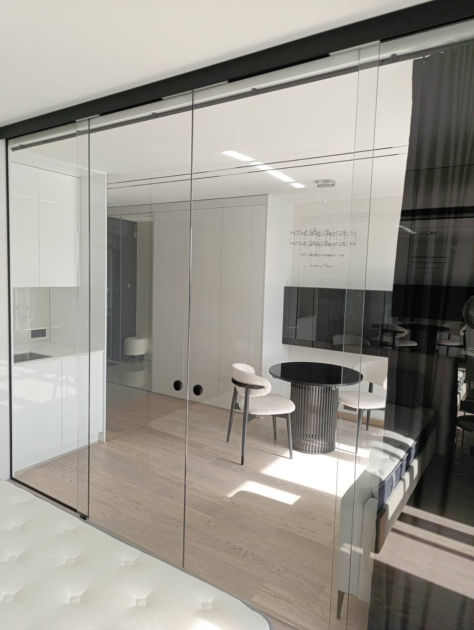 Графитовое зеркало обладает приятным темно-серым оттенком. Оно хорошо вписывается в строгие офисные помещения. Из такого стекла часто делают двери.